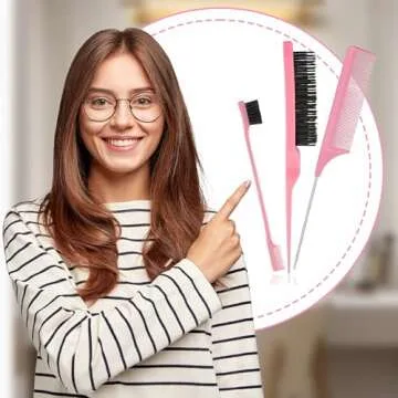 Hair Brush Set, 3 Pcs Slick Back Hair Bristle Brush, Rat Tail Comb, Edge Brush for Smoothing Hair & Flyaways - Pink