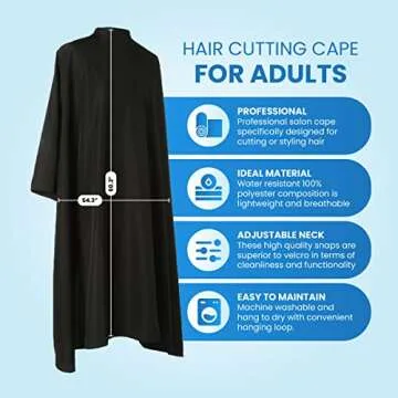 Show more Introducing the ultimate solution for effortless hairstyling, the Salon Quality Haircutting Cape is a professional-grade cape designed specifically for cutting and styling hair. Made by a trusted brand known for quality salon supplies, this cape is perfect for both professional salon use and home haircuts. With dimensions of 60 inches by 57.5 inches (152cm x 146cm), it provides ample coverage to keep both clients and family members comfortable and free from pesky hair clippings.
