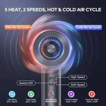 ... Show more Experience the future of hair care with our revolutionary Hair Dryer with Diffuser. This state-of-the-art hair dryer boasts an impressive 1500-watt high-speed brushless motor, delivering a powerful airflow of up to 19m/s, making it five times faster than conventional hair dryers. With five heat settings and two air speed settings, you can customize your drying experience. The one-touch hot/cold cycle mode ensures your hair maintains its health and shine.