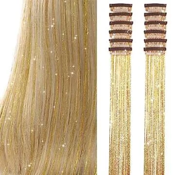 Show more Introducing the dazzling Clip-In Glitter Tinsel Hair Extensions, a delightful accessory that allows you to express your creativity and flair like never before! Designed with a user-friendly metal clip, installation and removal are effortless. Simply open and close the clip to transform your ordinary hairstyle into a glamorous masterpiece. These extensions boast a length of 20 inches and are made from 100% polyester fiber, ensuring they shine brilliantly in any light while remaining smooth and tangle-free.