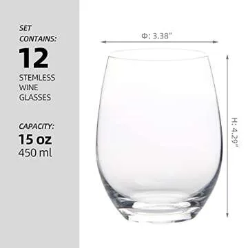 HAKEEMI Set of 12 Stemless Wine Glasses for Red White Wine, 15 oz, Crystal, Dishwasher Safe