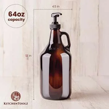 Show more Introducing the ultimate blend of style and functionality with the Half Gallon Glass Pump Dispenser Bottle by Kitchentoolz. Crafted in the USA, this beautifully designed jug features a thick-walled golden amber glass that is robust enough to withstand the rigors of daily use. With a generous 64 fluid ounce capacity, it’s perfect for various applications from laundry soap and fabric softeners to elegant syrup dispensing. The wide-base bottom prevents tipping and spilling, making it a reliable choice for busy homes and commercial spaces alike.