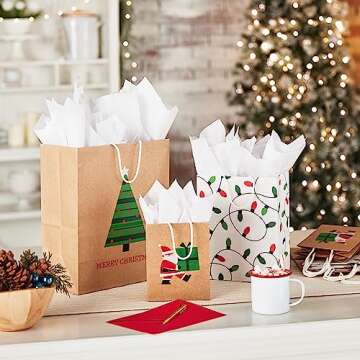 Hallmark Christmas Gift Bags for Kids (8 Bags: 3 Small 6", 3 Medium 9", 2 Large 13") Recyclable Kraft with Santa, Lights and Tree