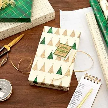 Show more Welcome to the perfect holiday gifting solution with our premium 3-pack of Hallmark's fancy gift wrap! This magnificent collection features a total of 120 square feet of high-quality wrapping paper, with each roll measuring 30 inches wide by 16 feet long. This means you'll have all the space you need to beautifully wrap presents for all occasions. Embrace the festive spirit with three elegant designs in stunning green and gold: a delightful metallic gold with graceful Christmas trees, an eye-catching emerald green tartan plaid, and a sophisticated geometric grid adorned with ornate snowflakes. Each design has been carefully crafted to present your gifts in the most delightful manner.