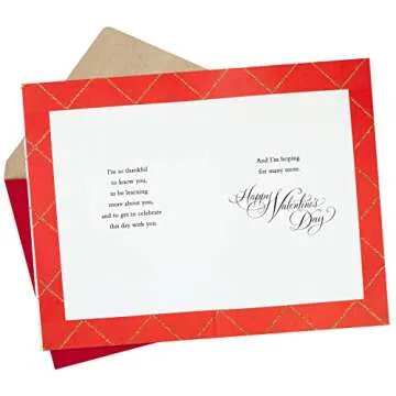 Show moreIntroducing the Hallmark Valentine's Day Card for New Relationship, thoughtfully designed to celebrate love and connection in its purest form. This stunning card is perfect for anyone who wants to express their heartfelt emotions to their newfound partner. Featuring a breathtaking red foil and glittery gold paper heart, beautifully attached with pristine white ribbon against a dazzling diamond background, this card is not just a piece of stationery; it’s a keepsake that captures the essence of budding romance. Inside, it reveals a warm and inviting message: "I'm so thankful to know you, to be learning more about you, and to get to celebrate this day with you. And I'm hoping for many more. Happy Valentine's Day." Designed to foster a sense of intimacy and gratitude, this card is tailored for those special moments shared with someone you cherish.