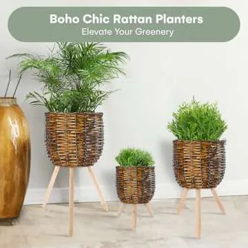 Hallops Rattan Planter Basket, Set of 3 - Tallest Stand Measures 26.7"x11" - Handwoven Plant Basket for Indoor Plants - Durable and Elegant Wood Material for Boho-Inspired Home Décor - Brown