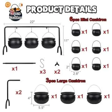 Show moreIntroducing the Halloween Cauldrons Serving Bowl Decor, a comprehensive 9-piece set designed to add a touch of whimsy to your Halloween celebrations! This delightful ensemble features 3 large black plastic witches cauldrons and 6 charming mini cauldrons, perfect for serving up Halloween treats or for use as trick-or-treating buckets. Crafted for durability and aesthetic appeal, the cauldrons boast a realistic embossed black flame surface, enhancing their spooky charm. With large cauldrons measuring 5.5 x 4 inches and mini cauldrons at 2.8 x 2 inches, there's ample space for candies, snacks, or party favors. The included sturdy iron rack ensures your cauldrons hang securely, making them not just functional but also a captivating centerpiece for any Halloween gathering.