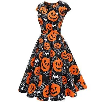 Show more Introducing the perfect blend of style and comfort for the festive season! This delightful Halloween dress is crafted from premium quality material, composed of 98% Cotton and 2% Spandex, making it slightly stretchy and wonderfully comfortable against the skin. Its durable fabric ensures that it won't easily wrinkle or fade, allowing for vibrant wear year after year. Designed specifically for festive fun, the dress showcases a whimsical array of Halloween prints, ensuring you stand out while celebrating this spooky holiday. With its square neckline and cap sleeves, it strikes the ideal balance between modern chic and classic elegance.