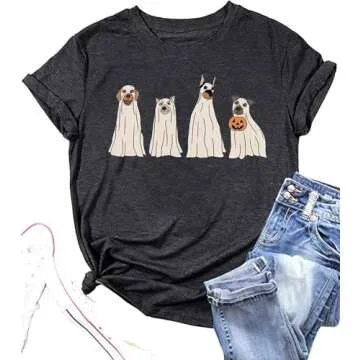 Halloween Ghost Dog T Shirt Women Dog Lover Shirt Funny Spooky Pumpkin Graphic Tshirt Fall Holiday Shirts Tops(D-Dark Gray1,L)