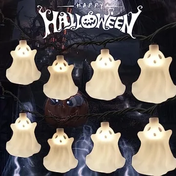 Show more Illuminate your Halloween festivities with our enchanting Halloween Ghost String Lights. Measuring 8.5 feet in length and adorned with 10 charming ghost figures, these lights are designed to drape beautifully across doorways, windows, or fences, creating a whimsical yet spooky atmosphere. The black wire seamlessly blends into the darkness of Halloween night, allowing the delightful white ghost shapes to take center stage. Thanks to their unique 3D design, these ghostly lights achieve a stunning visual effect, adding depth and a touch of realism that enhances your celebration.