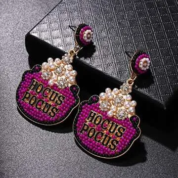 Show moreUnleash your spirit of fun and whimsy this Halloween with our Halloween Hocus Pocus Cauldron Beaded Dangle Earrings. These articulate, vibrant earrings are handcrafted with premium quality glass beads that create a striking cauldron design. The intricate details showcase the magic of Hocus Pocus, ensuring they become a standout accessory for any Halloween celebration. Not only do they bring a playful yet spooky vibe, but their bright colors and cheerful design complement a wide range of outfits, from costumes to casual wear!