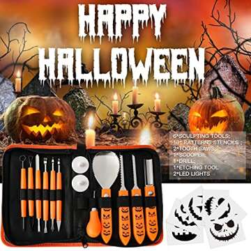 Introducing the Halloween Pumpkin Carving Kit, a complete 23-piece professional-grade carving set designed specifically for creating stunning jack-o'-lanterns and Halloween decorations. Crafted with high-quality stainless steel, this set includes everything you need to turn your Halloween vision into reality. It features 6 sculpting tools, 2 tooth saws, 1 scooper, 1 drill, 2 etching tools, 2 candle lights, and 10 pattern stencils, all stored securely in a sturdy zippered nylon carrying case...