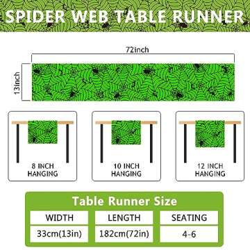 Show more Transform your dining area into a spine-chilling showcase this Halloween with our stylish Halloween Table Runner. Crafted from high-quality polyester linen, this runner, measuring 33cm x 182cm (13" x 72"), perfectly fits tables seating 4 to 6 people. Its eye-catching green backdrop, adorned with intricate spiderwebs and captivating bats, adds a festive touch that will surely impress your guests. Whether you are throwing a hauntingly delightful party or decorating for a spooky movie night, this quilted table runner is a must-have to elevate your seasonal decor!
