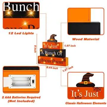 Halloween Wooden Block Sign with Led Lights- It's Just a Bunch of Hocus Pocus Witch Light up Wood Sign Decor for Table Mantle- Halloween Festive Haunted House Farmhouse Home Tabletop Tiered Tray Decor