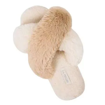 HALLUCI Women's Cross Band Soft Plush Fleece House Indoor or Outdoor Slippers (Small, Beige/Camel)