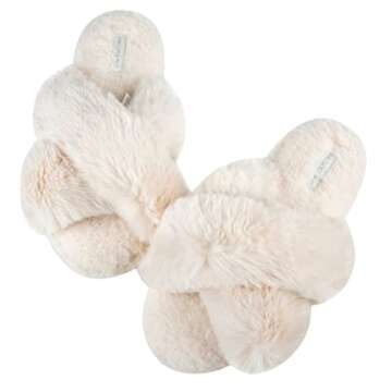 HALLUCI Women's Cross Band Soft Plush Fleece House Indoor or Outdoor Slippers (X-Large, Beige)