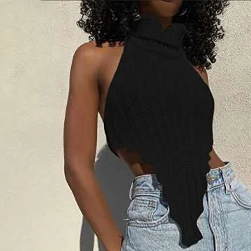 Halter Neck Crop Cami Top Knitted Printed Tank Tops Tee Y2k Sleeveless Strappy Summer Shirts Streetwear(U Irregular Black,S)