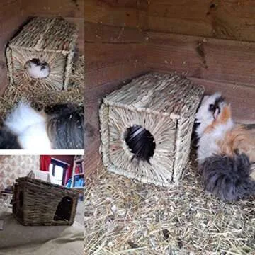 Show more The **Hamiledyi 2 Pcs Grass House** for rabbits and small pets is an essential addition to your furry friend's habitat. Designed thoughtfully for comfort and play, this charming collection of natural hand-woven seagrass huts measures **11.81"L x 7.87"W x 7.87"H**, ensuring a cozy fit in most small animal cages. Whether your pet is a guinea pig, a playful rabbit, a curious chinchilla, or even a mischievous squirrel, these huts will provide the perfect space for burrowing, relaxing, and exploring. The charming design makes it not only functional but a delightful enhancement to any pet enclosure, allowing for mobility and ease in adjusting its placement. Please note that these huts are designed for smaller pets, particularly suitable for newborn bunnies, while larger breeds may find them snug.