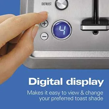 Show moreIntroducing the remarkable Hamilton Beach 2 Slice Toaster, a kitchen essential designed for those who relish the art of perfect toasting! The sleek stainless steel design brings sophistication to your countertop while the innovative digital display keeps you informed on your chosen toast shade setting. Say goodbye to uneven toast and hello to beautifully golden bagels, fluffy toasted bread, or your favorite frozen waffles, all at the touch of a button!