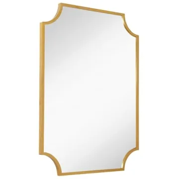 Show more Introducing the Hamilton Hills Brass Framed Vanity Mirror—a beautifully crafted piece that promises to elevate your home decor with its 30" x 40" scalloped design. This mirror is not just an accessory; it's a statement of elegance and functionality. Inspired by a chic bohemian aesthetic, its luxurious gold finish adds a refined touch to any room, making it perfect for your bathroom, entryway, or living room. The scalloped edges are not only visually striking but also a practical solution for spaces requiring unique installation due to outlets or switches.