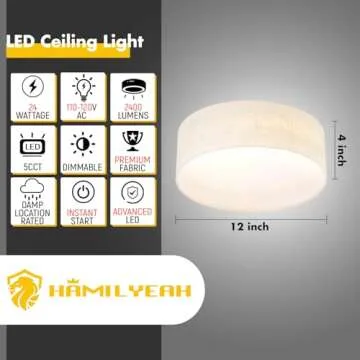 Hamilyeah LED Ceiling Light Flush Mount 24W, 12inch Kitchen Lighting Fixture Ceiling Mount with Fabric Shade, Dimmable Ceiling Lighting Fixture 5CCT for Bedroom, Bathroom, Living Room, Kitchen