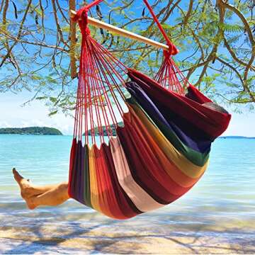 Why You Will Love This Product: The Hammock Sky Large Brazilian Hammock Chair is not just a piece of furniture, it's an experience that transforms any space into a sanctuary. Imagine sinking into this breathable, plush chair as the world fades away, allowing you to drift off into a state of blissful relaxation. This chair is designed for the moments when you seek solace, reflection, or even enjoyment with loved ones. Every detail - from the vibrant colors to the sturdy design - aims to elevate not only your physical space but also your mental disposition, creating an environment of peace and harmony in your life.