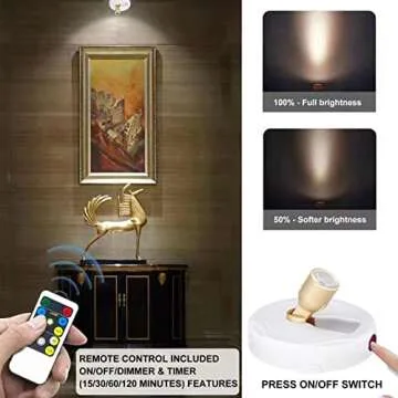 One of the standout features is the remote control capability, which lets you operate the lights conveniently within an 18-foot radius. No need to get up from your seat! With the built-in timer and dimmer presets (15/30/60/120 minutes), you can effortlessly customize your lighting experience—whether you desire a soft, inviting glow or full brightness to accentuate your decor. The spotlights are powered by 3 AA batteries (not included) and boast up to 40 hours of runtime at full brightness, emitting a warm and inviting 3000K light that delivers a pleasant ambiance in any room.