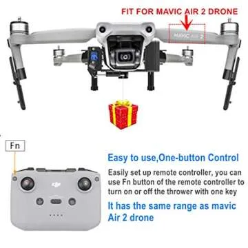 Show more The perfect companion for drone enthusiasts, this specially designed drop device is compatible with the DJI Air 2S & Mavic Air 2 drone models, ensuring a seamless experience for all your aerial adventures. With a unique one-button operation through the remote controller, you can easily release items from your drone within any range it can reach, making it perfect for various applications like fishing, holiday decorations, or even professional tasks. The thoughtful design of the drop mechanism allows for maximum load of 500g, while the built-in 150mAh battery ensures a standby time of approximately 12 hours.