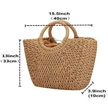 Hand-woven Straw Large Hobo Bag for Women Round Handle Ring Toto Retro Summer Beach (Brown)