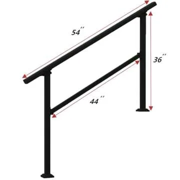 Show moreIntroducing the Handrails for Outdoor Steps – a perfect blend of safety and style! Crafted with high-quality wrought iron, our handrail kit not only enhances the aesthetic of your outdoor or indoor steps but also ensures a secure grip to prevent falls. Designed for versatility, this handrail adjusts effortlessly to fit 1 to 4 steps, allowing you to skip the hassle of cutting for the right height. With a stunning black finish that complements any decor and a robust construction capable of supporting over 500 lbs, this handrail is crafted to meet all rigorous building standards.