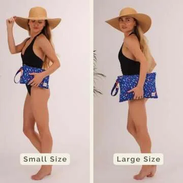 The beach wristlet bag boasts a specially designed water-resistant interior lining that keeps your valuables safe and dry, enhancing your beach experience without the worry of sand and moisture. Its easy-to-wipe surface means maintenance is a breeze, so you can focus more on enjoying your time in the sun. Measuring 10” in length and 7.5” in height, it conveniently expands up to 7” in depth when packed, allowing you to carry everything from sunscreen to a novel without burden.