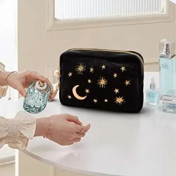 Handy cosmetic makeup bag,Navy Velvet Embroidered Applique Moon Stars Cosmetic Bag,Starry Makeup Pouch with Tassels & Pearl Zipper,Beautician Storage Bag