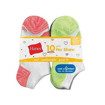Show moreIntroducing the Hanes Girls' Cool Comfort No Show Socks, a perfect blend of comfort, practicality, and style designed just for your little one. This 10-pack comes in an assortment of colorful designs that are sure to delight young girls as they go about their busy days, whether at school, during sports activities, or while hanging out with friends. Each sock is crafted with moisture-wicking and breathable fabric, ensuring that her feet stay cool and dry even during the most active days.