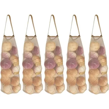 Show more Introducing our premium 5 Pack Multipurpose Net Produce Bags, the perfect combination of functionality and eco-friendliness. Designed for both kitchen enthusiasts and environmentally conscious consumers, these breathable mesh bags offer an innovative solution to your storage problems. Made from durable polyester, these bags not only provide exceptional strength but also feature a unique ergonomic design that includes a velcro tie closure at the bottom. This ensures easy access to your vegetables and fruits, enabling a quick and hassle-free experience every time you need to grab something.