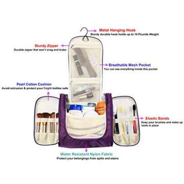 The exterior boasts three separate pockets, while the spacious interior contains two smaller compartments and a main pocket, brilliantly designed to help you discover what you need at a moment's notice. No more digging through a jumble of products! With a clever hanging hook, you can effortlessly elevate your toiletries, providing quick access while optimizing the limited space in hotel rooms or Airbnb rentals.