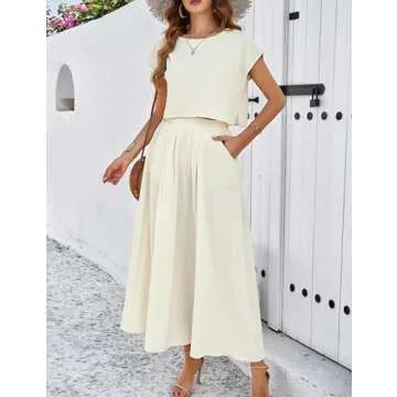 Show more Step into summer with the effortlessly elegant 2025 Summer Fashion 2 Piece Skirt Set, a chic addition to your wardrobe that exudes style and comfort. This stunning ensemble features a beautifully designed cropped summer top made from a high-quality, skin-friendly fabric that is softer than cotton. The top includes a crew neckline, cap sleeves, and a side slit that adds a fashionable twist to a classic silhouette. The high waist maxi skirt offers a wide-legged design with two handy side pockets, making it both functional and fashionable. Its front pleated design adds an element of sophistication, while the capri length ensures a comfortable fit.