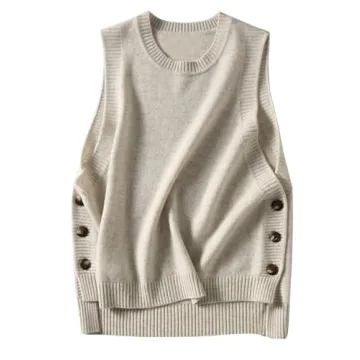 Show moreElevate your fashion game with the HangNiFang Women's Round Neck Sleeveless Pullover Ribbed Knit Sweater Vest Top. This exquisite vest, available in a chic beige shade, combines style and comfort seamlessly. Made from a soft, stretchy ribbed knit fabric, it provides both warmth and an unparalleled coziness that makes it perfect for those cooler days or casual outings. The clever design highlights three buttons on each side, adding a touch of flair to this versatile piece. Its rounded neckline ensures a refined look, while the delicate contrast in lengths between the front and back hem gives this vest a fashion-forward appeal that can effortlessly elevate any outfit.