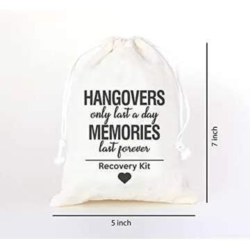 Show moreDiscover the perfect blend of charm and functionality with our "Hangovers Only Last a Day, Memories are Forever" favor bags! Designed thoughtfully for various occasions such as bachelorette parties, birthday celebrations, or corporate retreats, each pack contains **10 high-quality cotton drawstring bags**, measuring **7x5 inches**. The durable material ensures they can withstand the excitement of any gathering, while their stylish design transforms them into the ultimate keepsake for your guests. Whether you’re preparing hangover kits filled with essentials or simply spreading joy through thank-you gifts, these bags have got you covered.