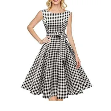 Show moreDiscover the elegant charm of the Hanpceirs Women's Boatneck Sleeveless Swing Vintage 1950s Cocktail Dress, meticulously crafted for modern-day fashionistas who appreciate timeless style. This stunning dress, featuring a classic black and white small plaid pattern, is designed to flatter your figure while providing all-day comfort. Made with a comfortable lining that’s not see-through, it hugs your body effortlessly, creating a sleek silhouette that's perfect for every occasion. The sleeveless style with a convenient concealed zipper at the back ensures effortless dressing, and the detachable belt serves dual purposes: cinching your waist and doubling as a chic hairpiece.