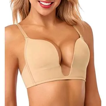 HANSCA Women's Deep Plunge Bra Cleavage Enhancer Low Cut Wireless Bra Padded Push Up (Nude, 32D)