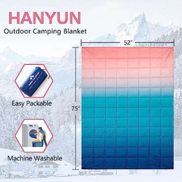 Show more Introducing the HANYUN Camping Blanket, your ultimate companion for any outdoor adventure! Measuring a generous 52"x75", this versatile outdoor travel blanket is expertly crafted from high-quality 20D ripstop nylon fabric, featuring a waterproof coating that guarantees to keep you dry regardless of the weather conditions. Whether you're camping under the stars, hiking through the woods, or lounging at a sunny concert, this blanket provides the perfect blend of comfort, style, and practicality. Its beautiful design, featuring an ombre color on one side and a solid blue on the other, not only enhances your outdoor aesthetic but also withstands wear and tear, making it a reliable companion for anyone who enjoys the great outdoors.