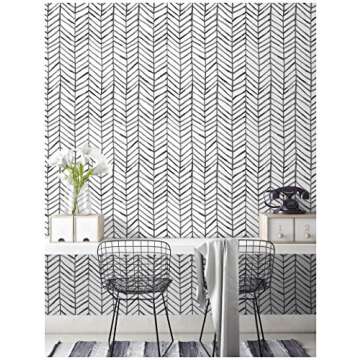 Show more Transform your space with the HAOKHOME 96020-1 Modern Stripe Peel and Stick Wallpaper. This chic herringbone design in classic black and white is not just a wallpaper; it's a statement piece that effortlessly enhances any room. Made from high-quality vinyl material, this removable wallpaper is designed for durability and ease of use, making it the perfect choice for home decor enthusiasts and DIY-ers alike. With a width of 17.7 inches and a length of 32.8 feet, each roll covers a generous 48.5 square feet, giving you ample material to create your desired look without the hassle of messy glues or water. Whether you’re updating a bathroom, accent wall, or any smooth surface, this wallpaper promises to deliver an elegant and modern touch to your home.