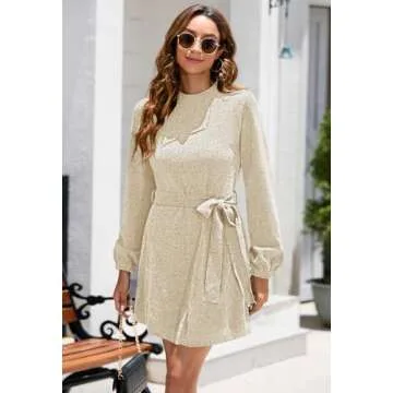 HAPCOPE Women's 2024 Fall Winter Elegant Chenille Sweater Dress Mock Neck Long Sleeve Short Dress with Belt Apricot S