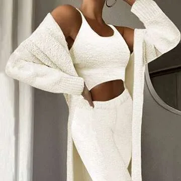 HAPCOPE Women's Fuzzy 3 Pcs Sweatsuit Open Front Cardigan Crop Tank Tops Wide Legs Pants Lounge Sets White L