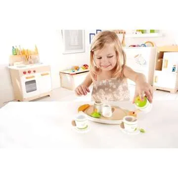 Show more Introducing the ultimate pretend play experience with the Hape Ultimate Pretend Tea Party Set, a delightful collection designed to inspire endless hours of imaginative fun! This exquisitely detailed tea set, made from high-quality wood, is perfect for sharing joyful teatime moments with friends—whether real or stuffed. Your little ones will adore the charming collection of accessories, including a graceful teapot, dainty cups and saucers, a whimsical spoon, a tea bag, a sugar bowl, and a delightful creamer, all neatly arranged on a colorful serving tray.
