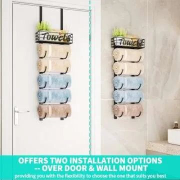 HapiRm 6-Tier Over The Door Towel Racks for Bathroom - Wall Mount Towel Holder with Metal Shelf Basket - Rolled Towel Storage Door Hanging Bath Towel Organizer for Small Bathroom, Camper, Rv - Black