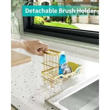 Show more Transform your kitchen experience with the HapiRm Kitchen Sink Caddy with Brush Holder. Crafted with precision, this multifunctional sink organizer is designed to redefine convenience and style in your culinary space. Featuring a robust 304 stainless steel construction adorned with a sleek gold finish, it’s not only aesthetically pleasing but also supremely durable, showcasing an effective anti-rust coating that ensures longevity even in the moistest environments. The dimensions of 8.26 x 3.62 x 4.72 inches offer a perfect size that fits seamlessly on your countertop without occupying precious space.