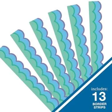 Show more Transform any space into a vibrant, retro-inspired haven with the Happily Ever Elementary Retro Remix Cool Waves Bulletin Board Borders. Designed in collaboration with the creative duo Stephanie and Loreal from @HappilyEverElementary, this 39-foot border trim adds cool colors and an engaging atmosphere to your decorations, whether in the classroom, at parties, or in personal spaces. Each strip features an eye-catching scalloped design in serene greens and blues, beautifully accented with purple and green outlines that enhance any backdrop. Elevate your decor with ease and style!