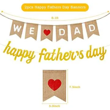 Show moreCelebrate Father's Day like never before with our stunning Happy Father's Day Banner and We Love Dad Burlap Banner set! Designed to express your heartfelt appreciation for the incredible father figure in your life, these banners collectively measure approximately 6.7 x 5.3 inches, making them a perfect addition to your festive decor. Their charm is amplified by a beautifully crafted pattern that showcases a metallic luster, guaranteed to make your gathering pop with vivid color and warmth.
