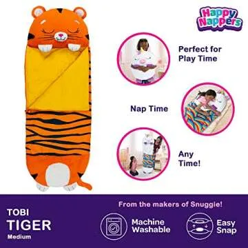 Show moreMeet the Happy Nappers Pillow & Sleepy Sack, the ultimate companion for your little ones that blends playtime excitement with cozy comfort! This particular design features a lovable Tiger character, ensuring that adventure and snuggles go hand-in-hand. Perfect for any occasion, Happy Nappers are not just toys; they transform into a cozy sleeping bag with a simple pull on the feet, making nap time a breeze. At a medium size of 54 inches in length and 20 inches in width, they are a compact yet delightful addition to your child’s travel or home play setup.